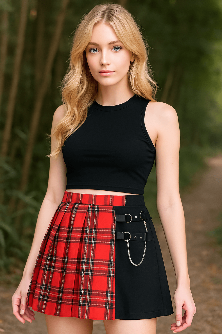 Plaid Strap Pleated Skirt